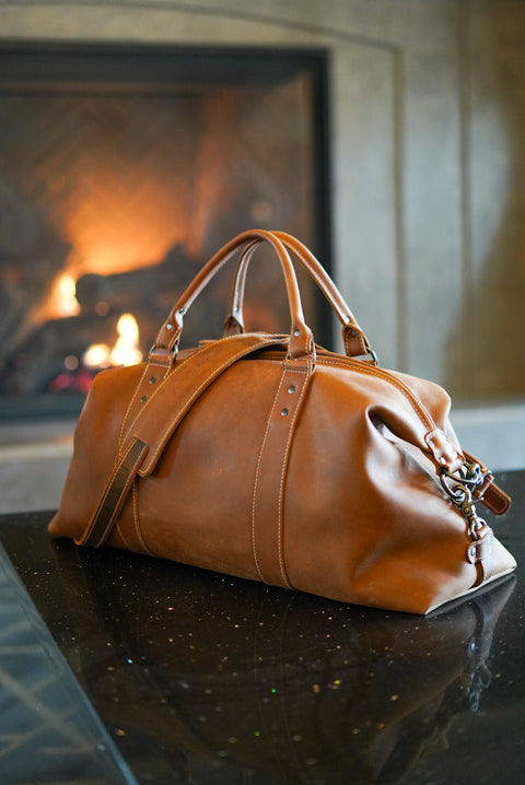 This weekender bag in the colour "Old Soul Tobacco" is a very unique (*special order) leather as it contains a "pull up" that will bring different contrasts (highlights and lowlights) as the bag is used.